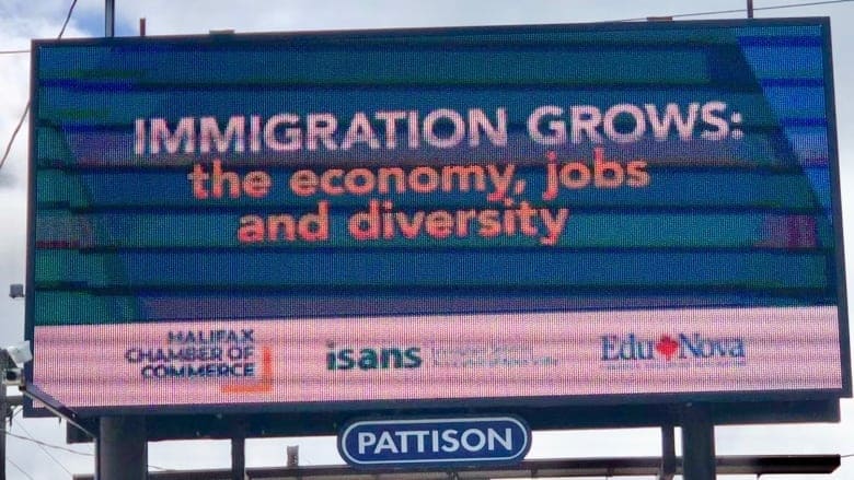 二周前,在温哥华,卡里加里,多伦多等地出现大幅广告牌“拒绝大规模移民”后(“Say NO to mass immigration” – 由民粹的“加拿大人民党”发起,现已撤除。小党,其在参议院没有席位,在下议院有1个席位)。新斯科舍省Nova Scotia在其首府哈利法克斯市周围竖起大量巨幅广告牌,用来宣传移民和国际留学生带来的好处,并以“弄清事实,并创造历史记录”为标语。这九个巨幅数字广告牌由哈利法克斯商会,新斯科舍省移民服务协会和省教育部,以及EduNova共同赞助。